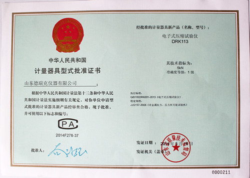 參加審核的型式批準(zhǔn)的樣機必須具備以下資料:(1)樣機外形照片;(2)產(chǎn)品標(biāo)準(zhǔn)(含檢驗方法);(3)總裝圖、電路圖和主要零部件圖;(4)使用說明書;(5)制造單位或技術(shù)機構(gòu)所做的試驗報告等,德瑞克電子拉力試驗機、電子式抗壓試驗機、電子式壓縮試驗儀等均滿足上述條件,并通過現(xiàn)場嚴格的零點誤差,線性誤差、力值誤差、顛簸實驗等嚴格考核實驗,各項技術(shù)指標(biāo)均達到國家1級試驗機的標(biāo)準(zhǔn)。