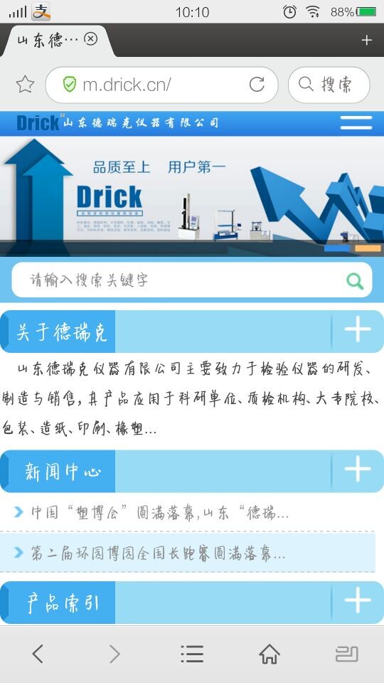山東德瑞克作為引領(lǐng)創(chuàng)新技術(shù)的領(lǐng)導(dǎo)者,一直不斷的創(chuàng)造新技術(shù),挖掘新技能,學(xué)習(xí)新知識(shí);“不斷創(chuàng)新”貫穿著德瑞克公司的發(fā)展歷程。我們秉承“客戶滿意是我們永無止境的追求”的服務(wù)準(zhǔn)則,為方便客戶更快速,更便捷的了解我們的產(chǎn)品,2015年新年伊始,特推出手機(jī)網(wǎng)站“m.drick.cn”“m.jndrktest.com”“m.worlddrick.com”供大家瀏覽,為全球客戶提供檢測(cè)儀器行業(yè)最新資訊,最新發(fā)展方向。